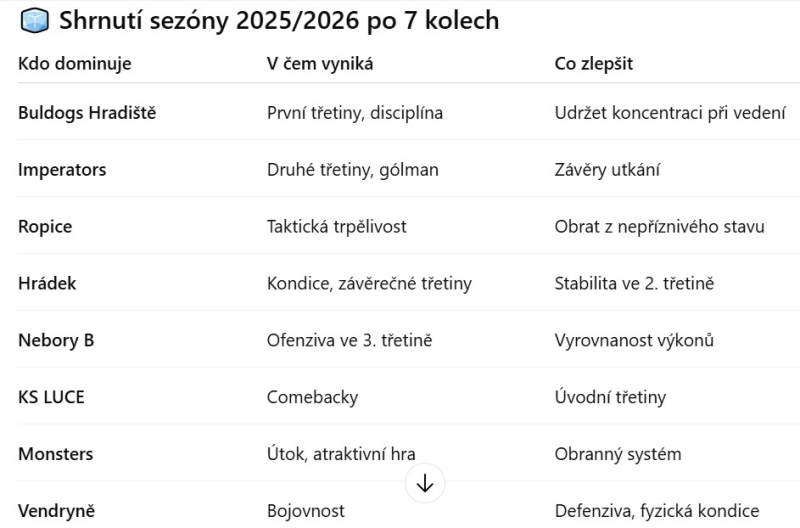 Třetinový trend: 1. třetina je jejich nejsilnější fáze (v úvodních kolech skóre 12:3).